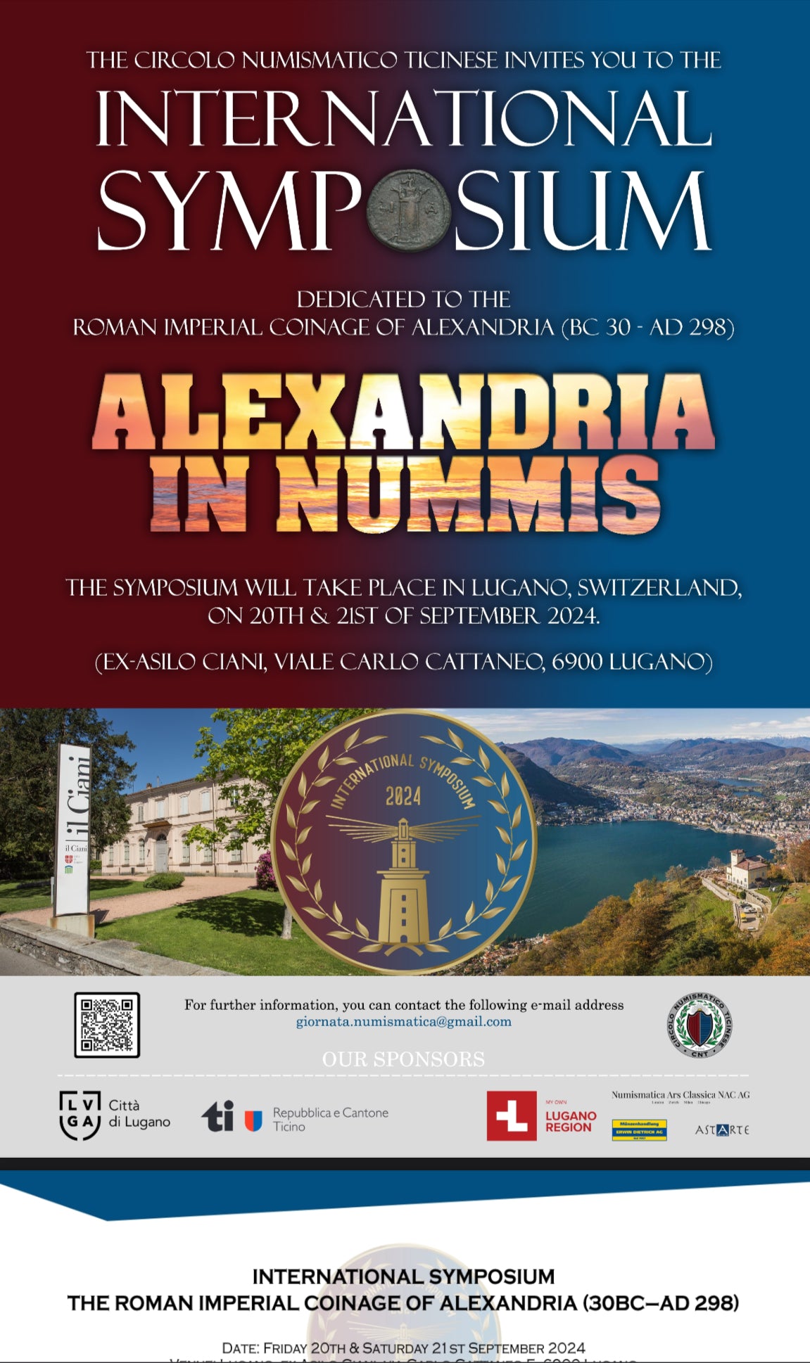Astarte SA was delighted to sponsor the INTERNATIONAL SYMPOSIUM DEDICATED TO THE ROMAN IMPERIAL COINAGE OF ALEXANDRIA (BC 30 - AD 298) ALEXANDRIA IN NUMMIS held in Lugano on 20 and 21 September 2024 with the presence of leading specialists in this fascinating coinage. The proceedings were opened by Prof. Zahi Hawass, Secretary General of the Supreme Council of Egyptian Antiquities and world-renowned Egyptologist.